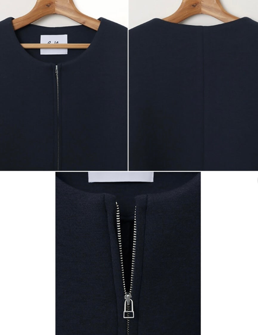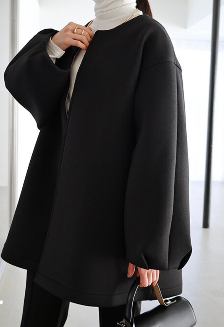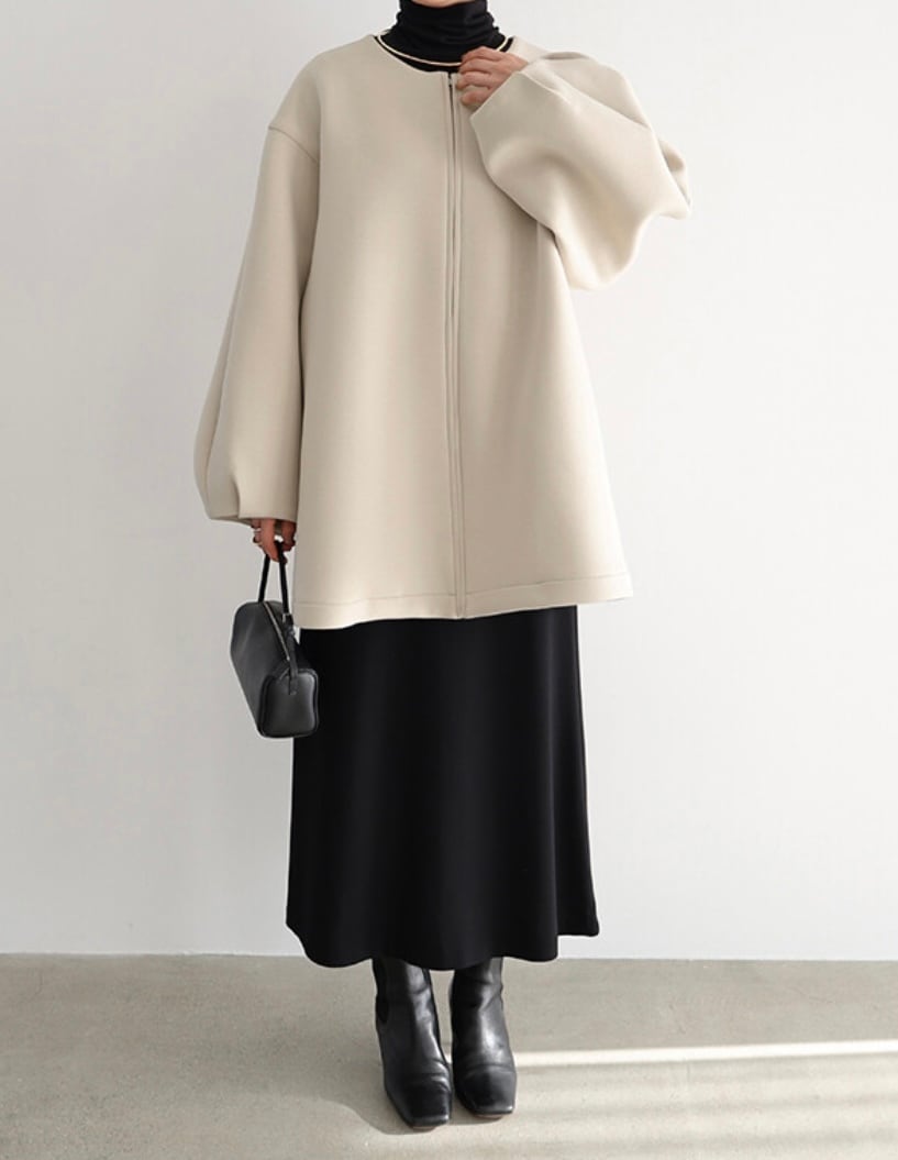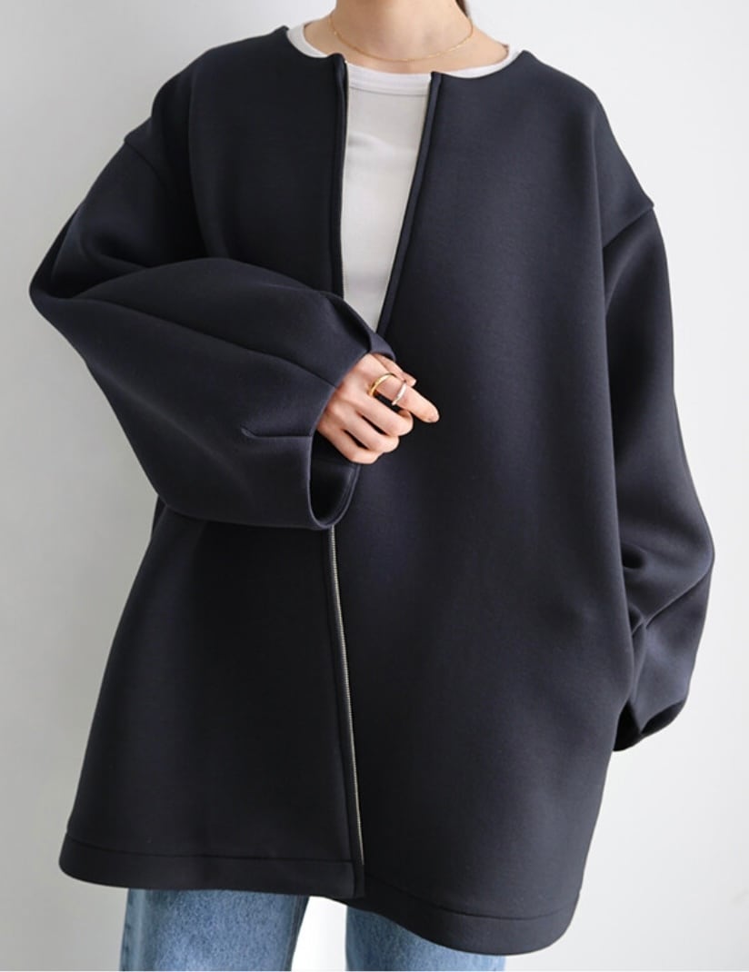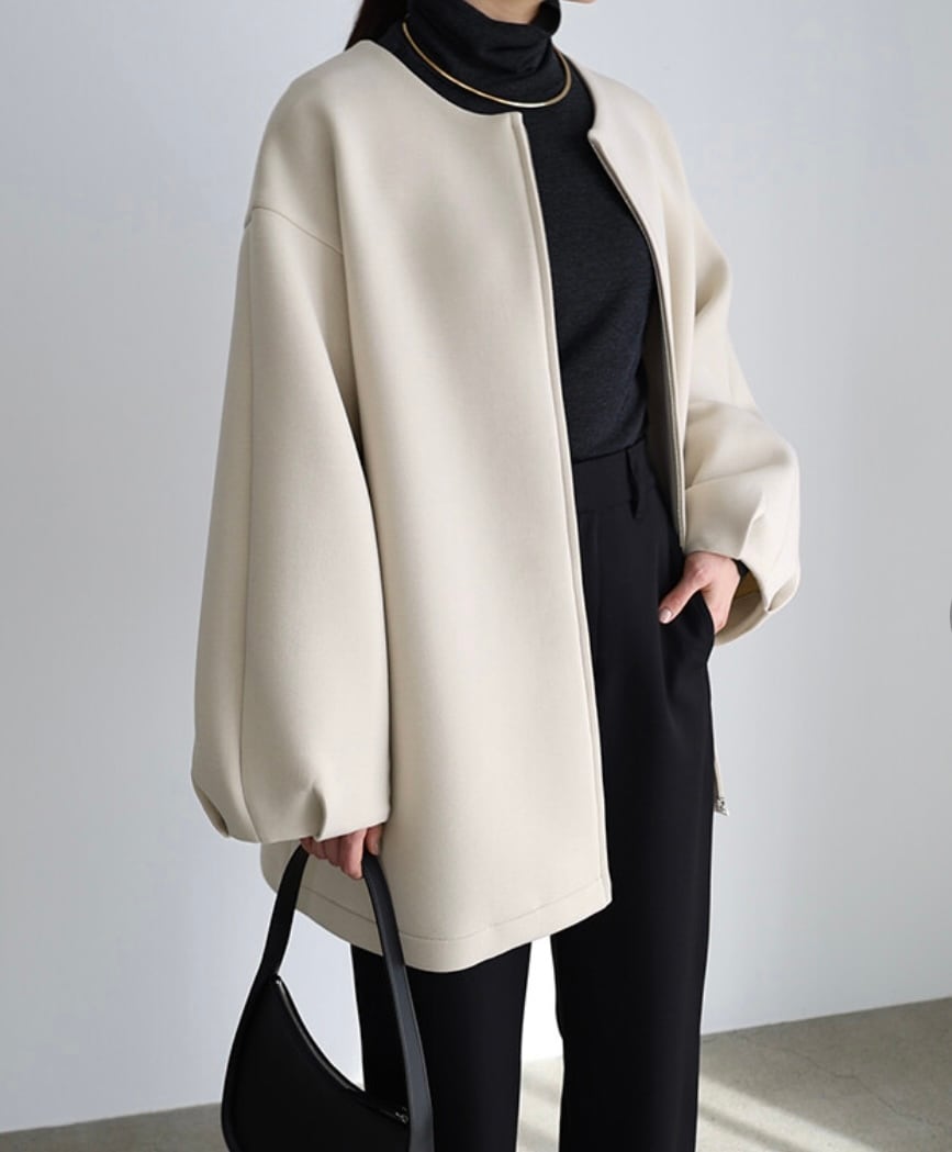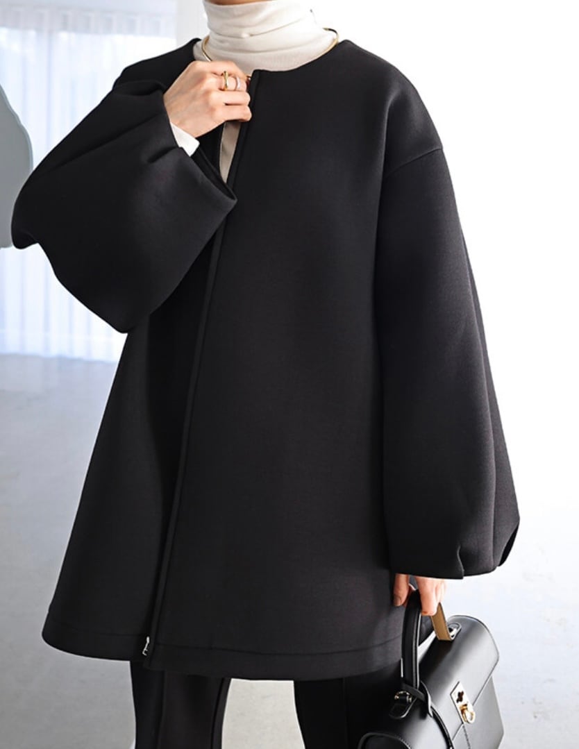 上品なノーカラーのネックデザインは、ハイネックやタートルネックとも合わせやすく、顔周りをすっきりと見せてくれます。