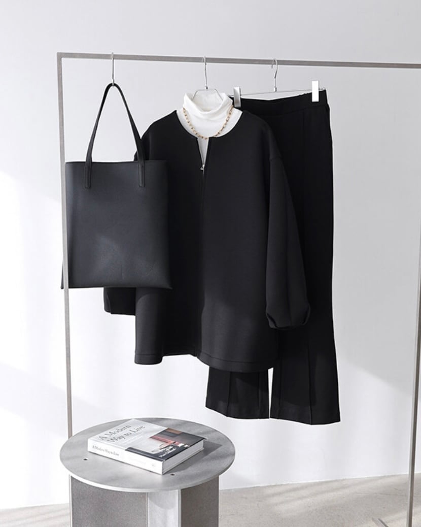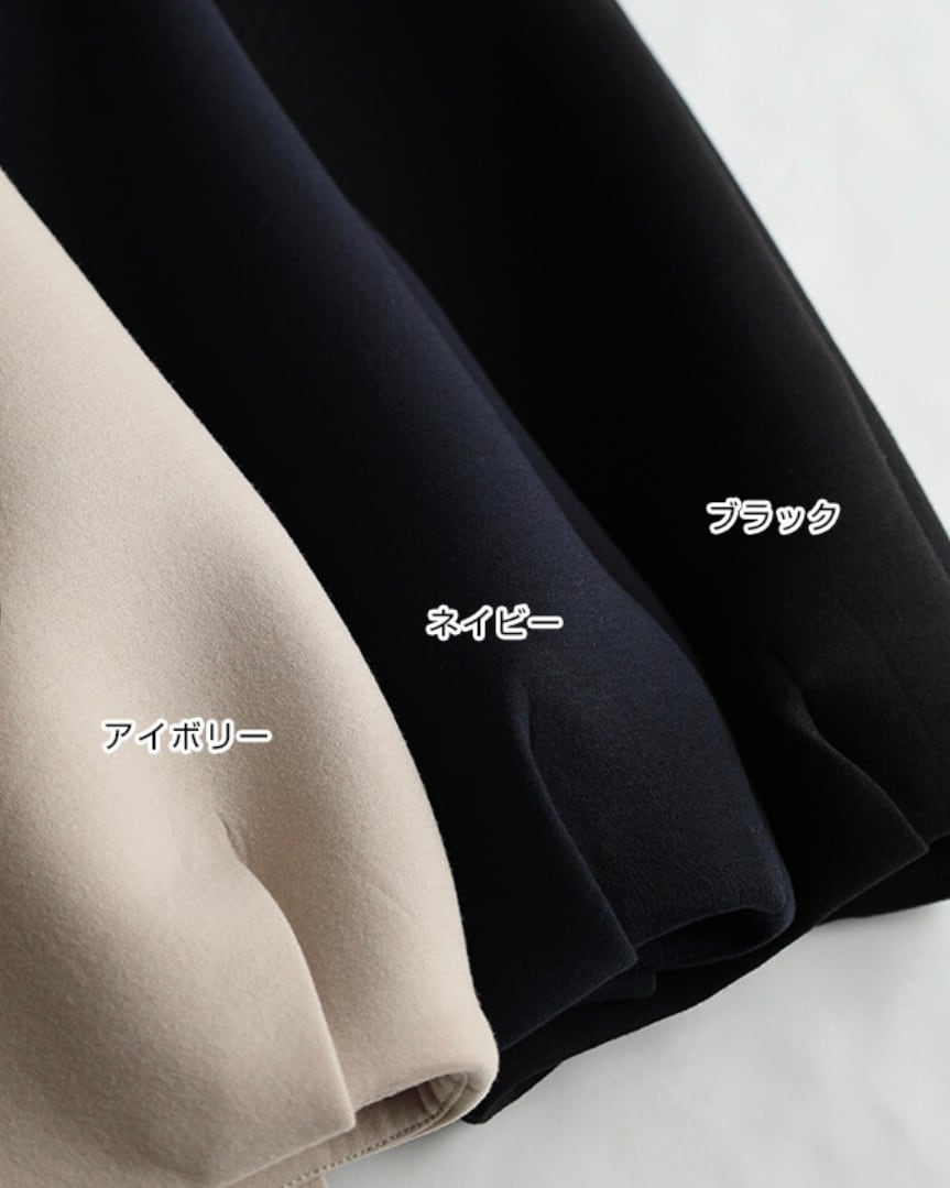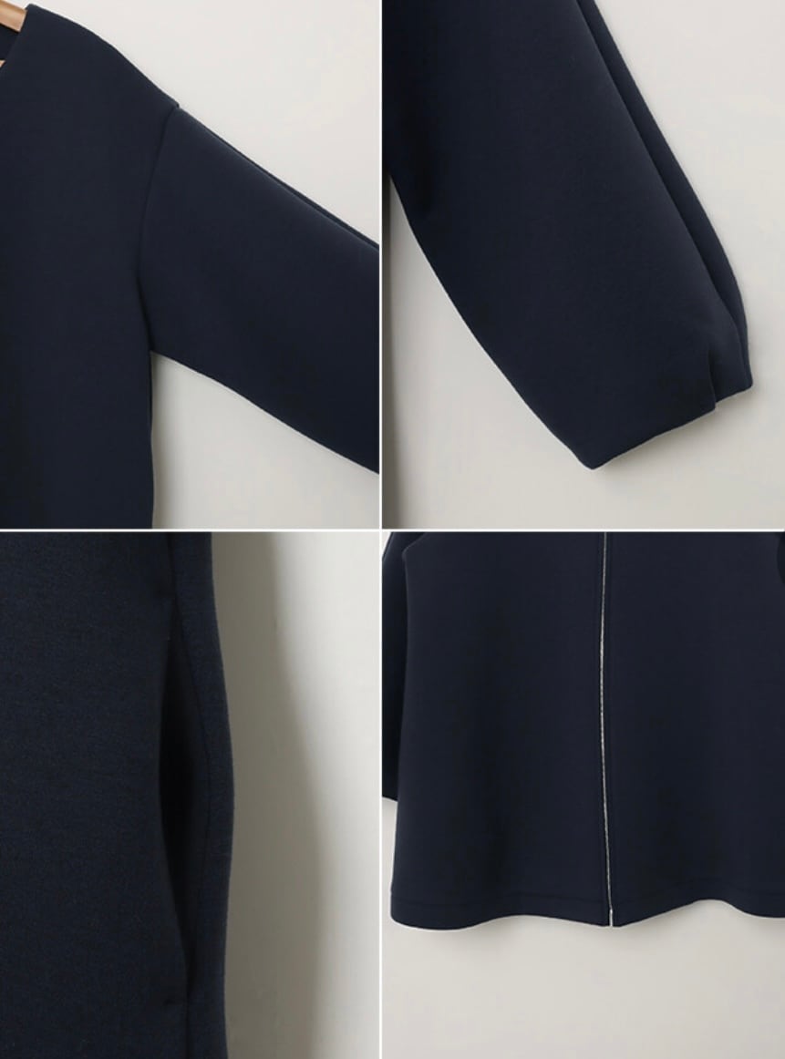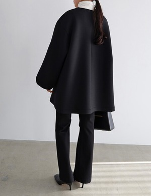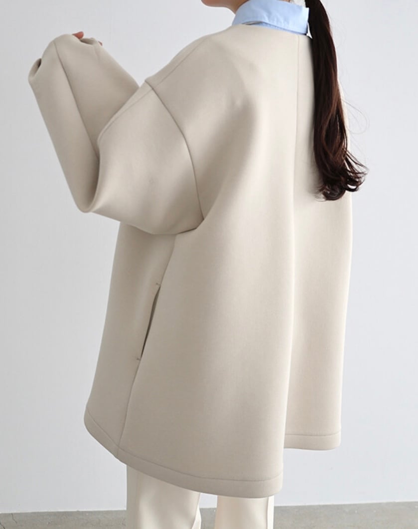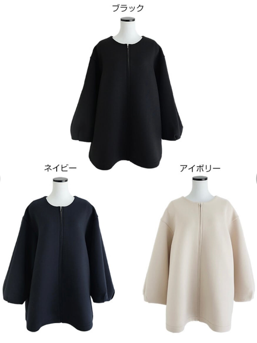 上品なノーカラーのネックデザインは、ハイネックやタートルネックとも合わせやすく、顔周りをすっきりと見せてくれます。
