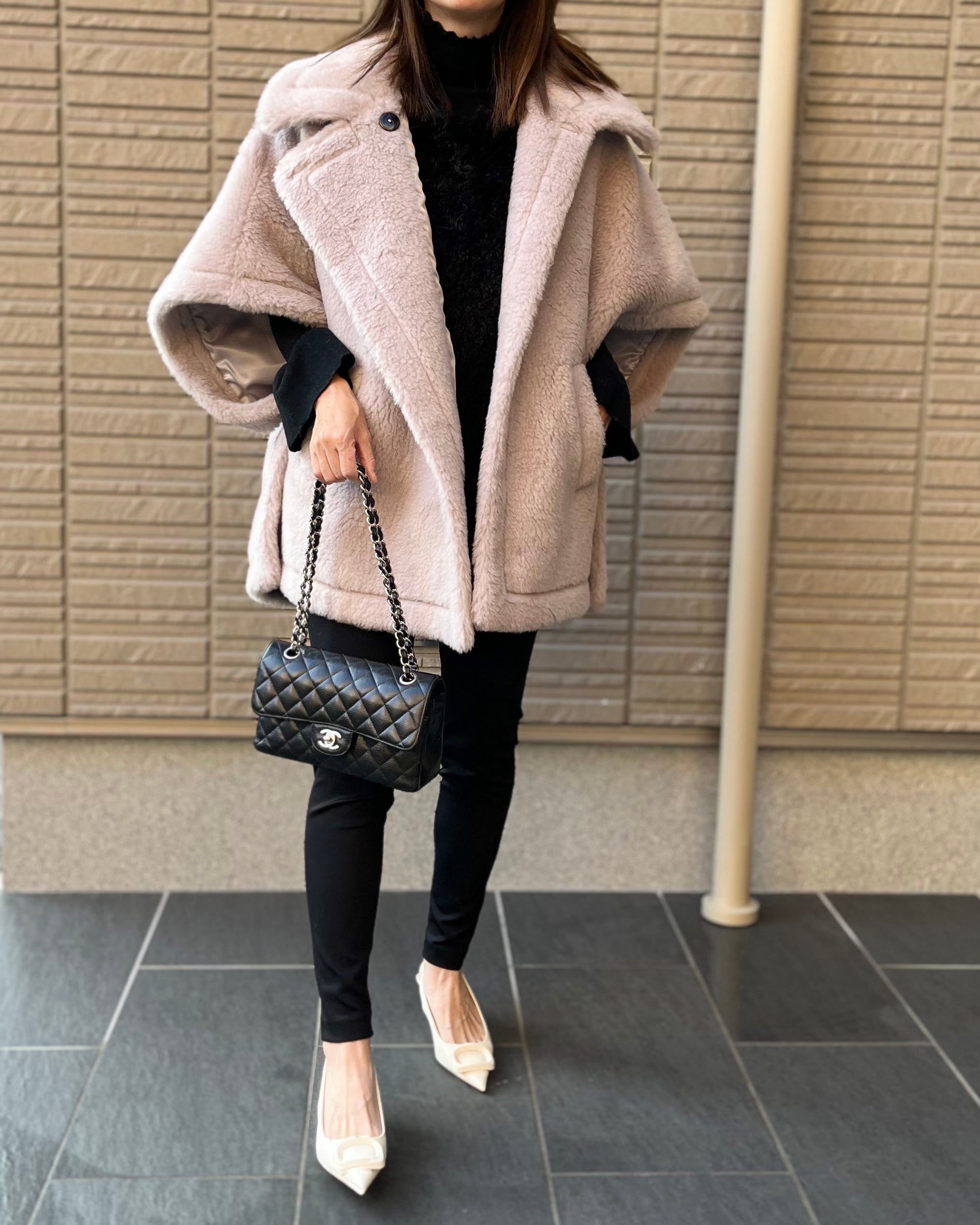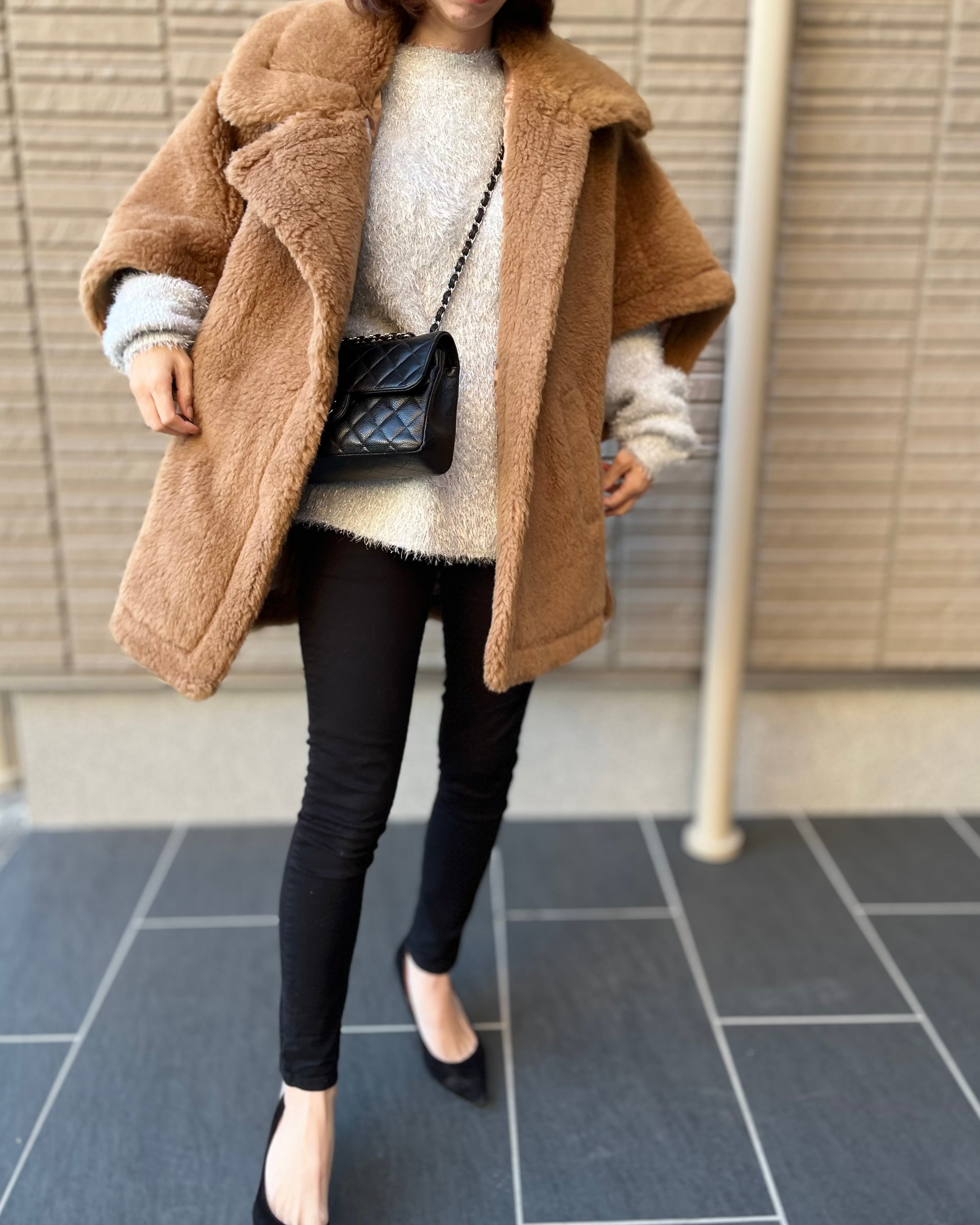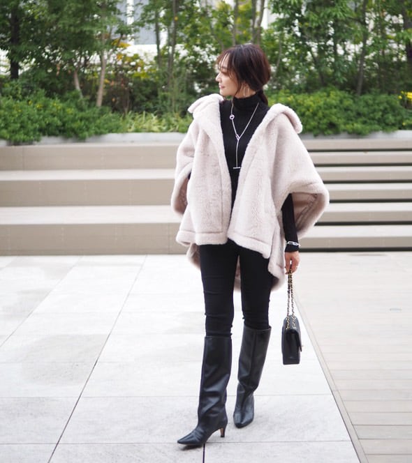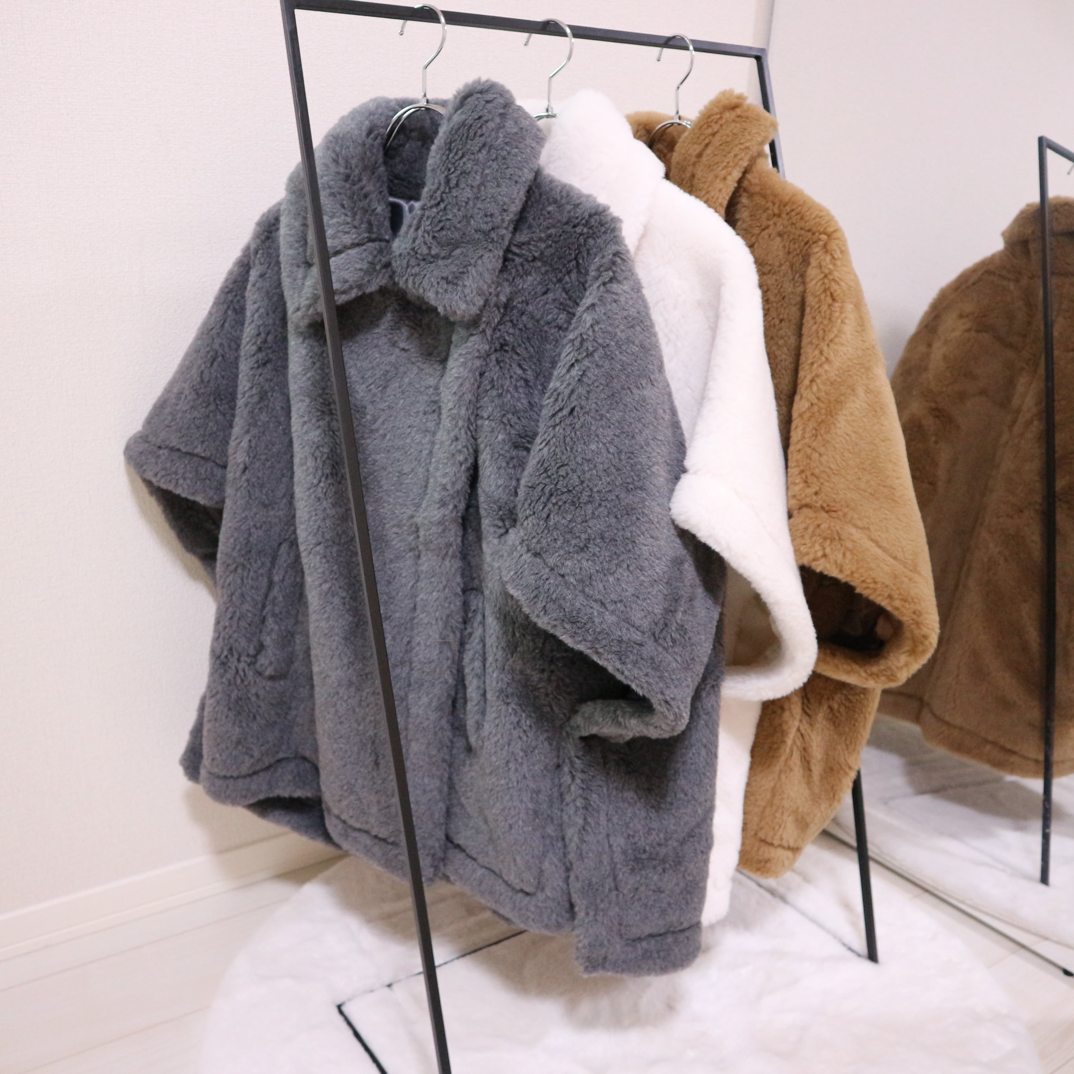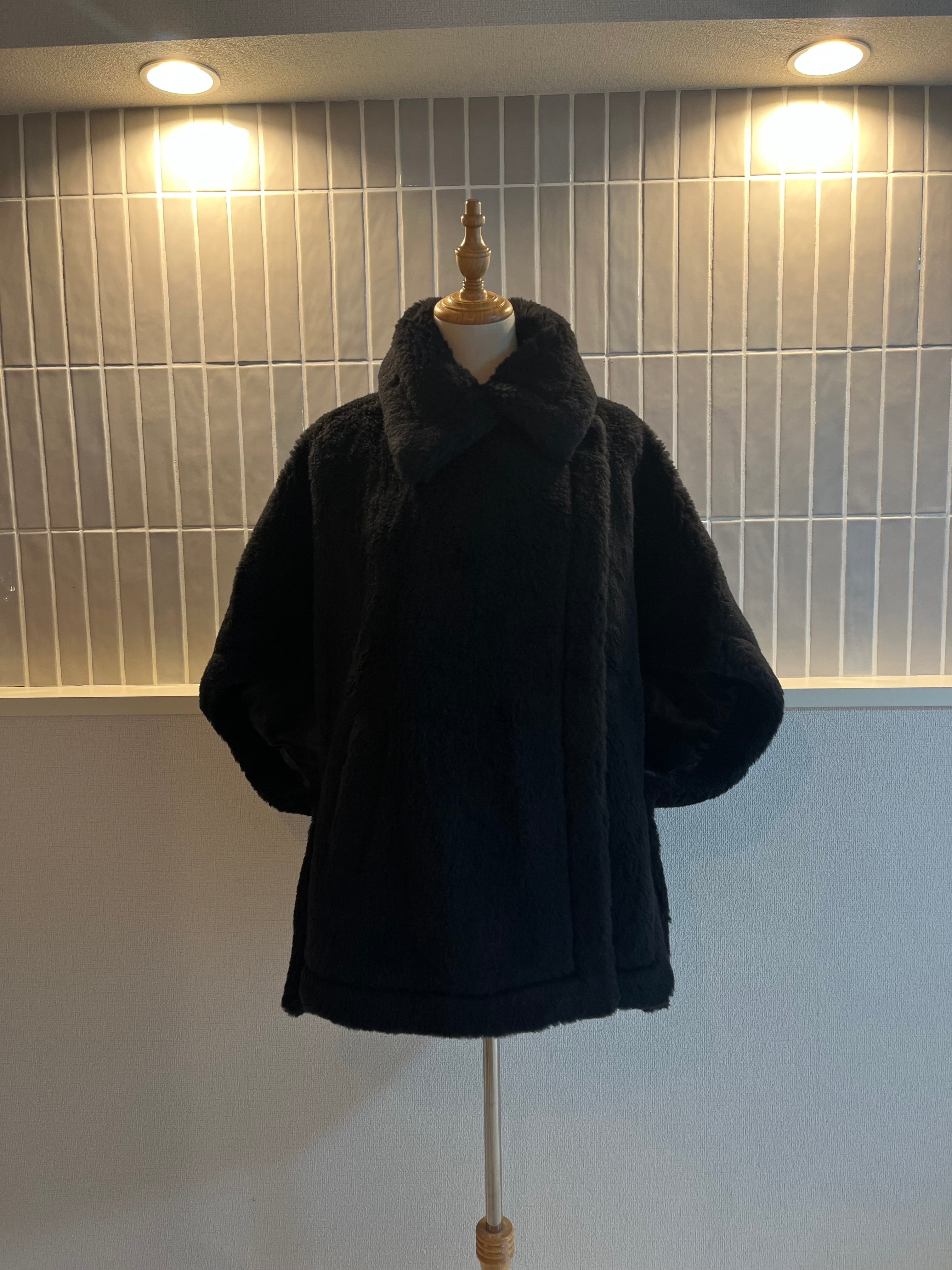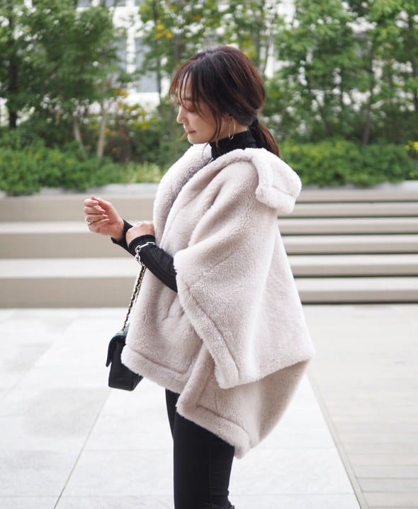 もこもこボアがアイコンのケープコートです。